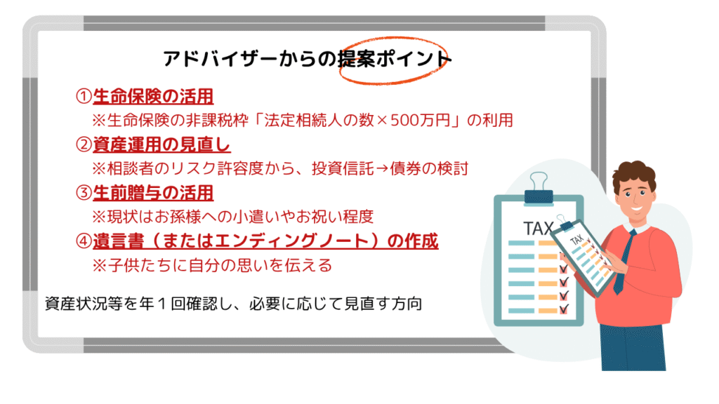 相談者の資産は、金融資産とご自宅を合わせると、この基礎控除額を超える可能性が高く、二次相続対策が必要だと判断しました。