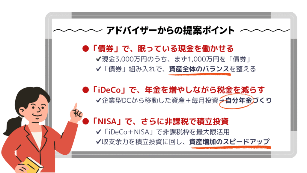 「現預金の多さ」と「iDeCoへの移行」という課題を元に、3つのアクションプランを提案しました。