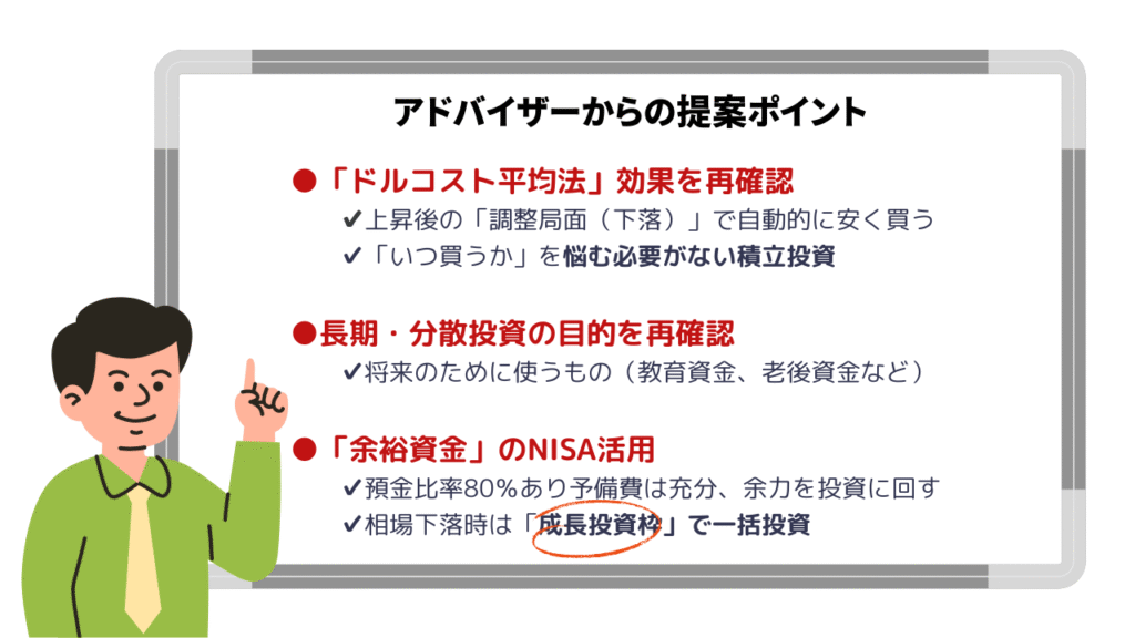 「成長投資枠の使い方が良くわかりました。積立投資も続けて行けそうです。でも、相場が下がった時に何を買ったらよいかわからないので、また相談しますね。」