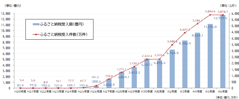総務省「ふるさと納税に関する現況調査結果(令和7年度実施)」によると、2024年度のふるさと納税の受入額は約1兆2,728億円、受入件数は約5,879万件、控除適用者は約1,079万人。