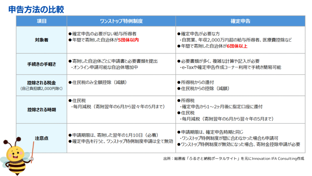 「ワンストップ特例制度」と「確定申告」には、それぞれにメリット・デメリット、手続き方法や控除される時期に違いがあります。